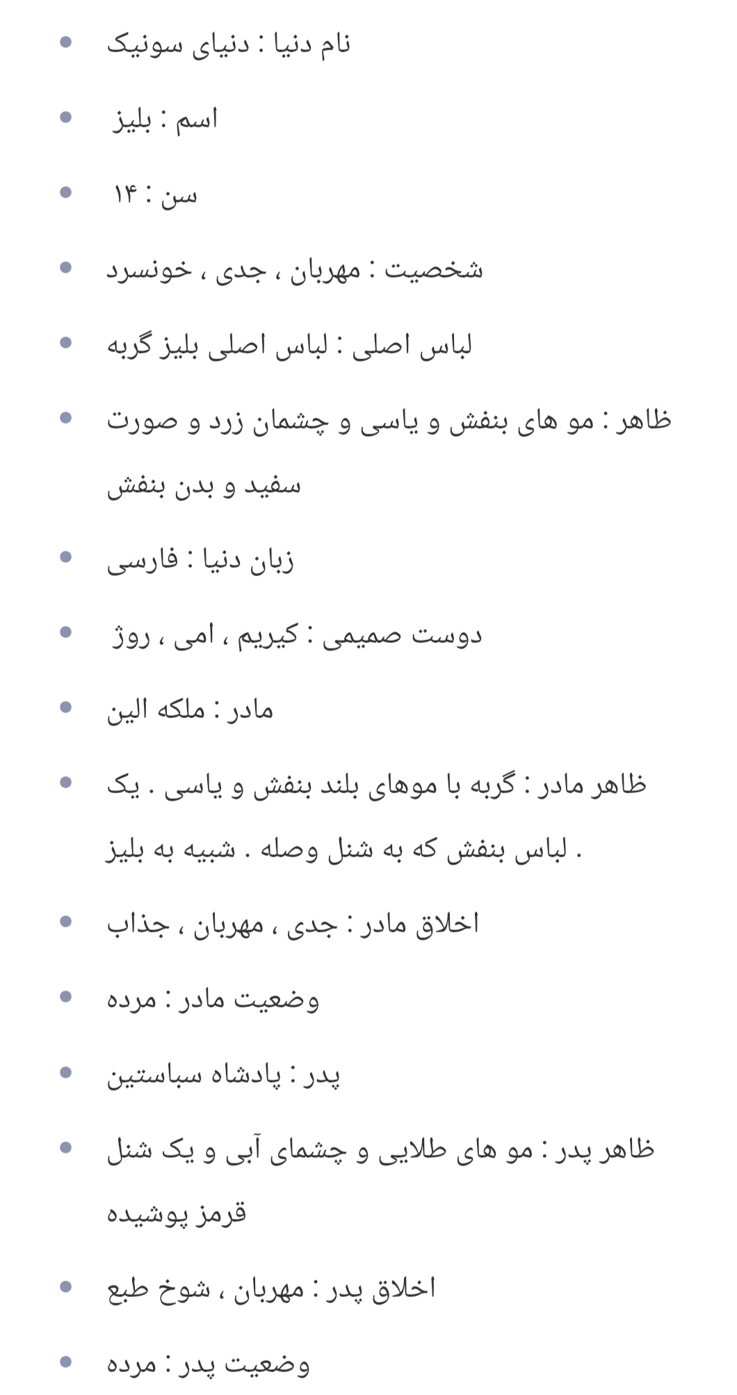 قدرت ، محل بیدار شدن ، زمان ، سیف ورد ، خاطرات ، مقام ( در صورت داشتن مقام بنویسید . ) ، محل زندگی ، وضع مالی ، وسایل ، زمان و روز بیدار شدن ، تغییرات بعد شیفت ( یعنی اینکه آیا وقتی از شیفت برگشتید زمان اونجا وایمیسته یا نه ) ، زمان بندی دی آر و سی آر ( مثلا هر ۱ دقیقه در دنیای واقعی معادل ۱ هفته در دنیای شیفت است ) ، غذای مورد علاقه .